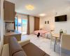Bright and welcoming with modern colors and furniture, this apartment has a beautiful living room with a comfortable double sofa bed and a well-equipped kitchen with electric hob and oven, fridge and microwave to meet every need. Air conditioning, LCD TV with satellite channels and WiFi guarantee the comfort of these rooms. Up to 4 beds, a double bedroom and a bathroom with toilet, bidet and shower box. What distinguishes the apartment is the beautiful corner terrace, which is large enough to be used as an outdoor living room. It is equipped with a dining table and is suitable for relaxing or dining in company. This apartment / suite is also an alternative for professionals who can telecommute in peace during their stay by the sea.