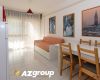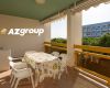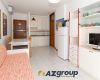 Two-room apartment featuring a bright living area with a fully equipped kitchenette, dining table, and a pull-out sofa bed for two people. The sleeping area includes a bedroom with a double bed and a single bed. The bathroom is equipped with a recessed shower with curtain. The apartment offers amenities such as TV, air conditioning, microwave oven, a large refrigerator with freezer compartment, and a washing machine located on the terrace. Guests can enjoy a spacious covered terrace furnished with table and chairs, perfect for outdoor dining and relaxing moments.