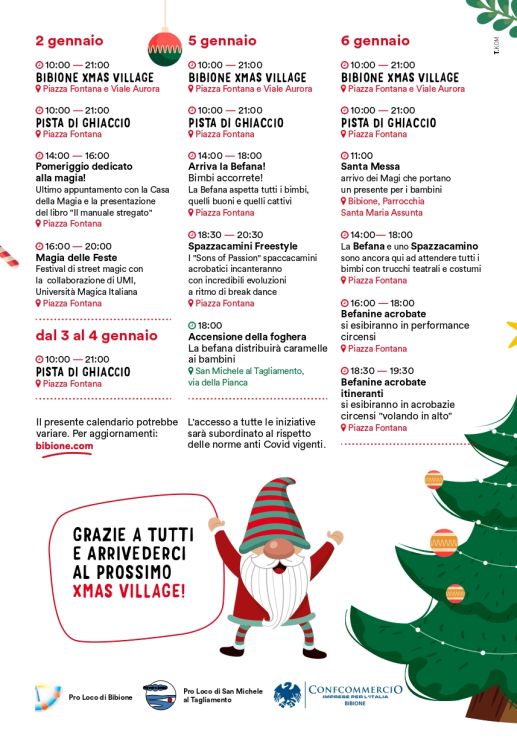 • in the opening days of the village we will be able to take a ride on the little train with two carriages that from Piazza Fontana, passing through the Parish of S. Maria Assunta, will arrive at Piazzale Zenith and back;