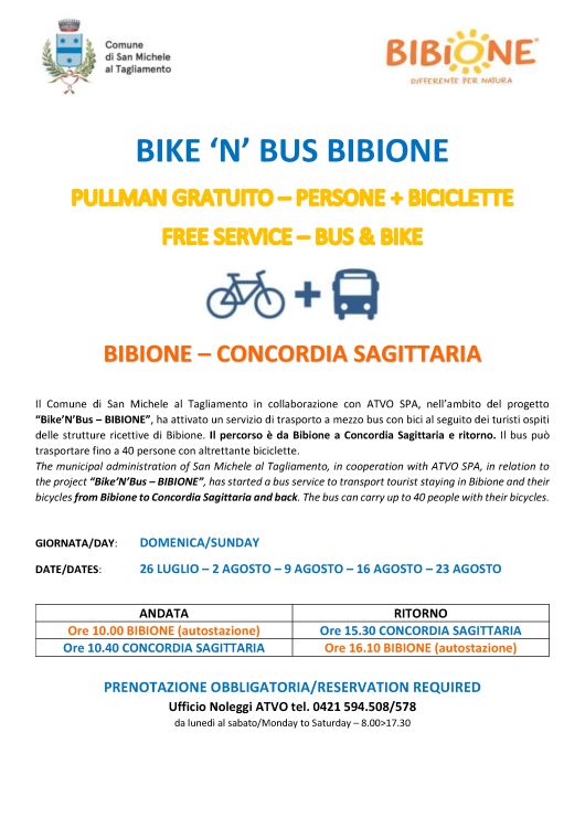 The City of San Michele al Tagliamento with ATVO Spa activated this service from Bibione to Concordia Sagittaria and back. The bus can accommodate 40 persons with their bicycles.